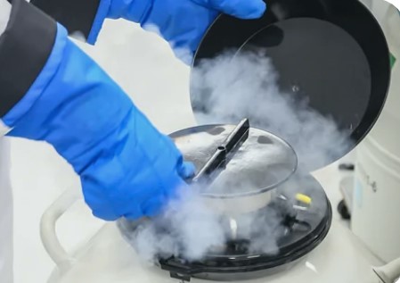 Хранение. Контейнеры с жидким азотом поддерживают температуру близкую к −196 °C. Электроника контролирует уровень азота, а персонал ведет журнал и регулярные проверки.